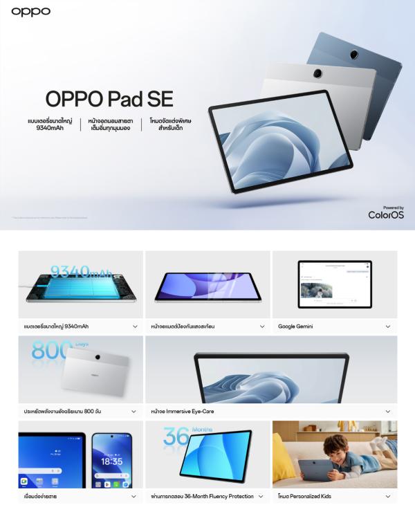 6,999 บาท ดาวว์ 1,000 รับเครื่อง OPPO Pad SE มีสเปคเด่นที่หน้าจอใหญ่ 11 นิ้ว ความละเอียด 1920 x 1200 พิกเซล, ชิปประมวลผล MediaTek Helio G100, RAM 4GB, หน่วยความจำภายใน 128GB (เพิ่ม microSD Card ได้), แบตเตอรี่ขนาดใหญ่ 9340 mAh, และรองรับชาร์จเร็ว 33W. มีกล้องหน้าและกล้องหลัง 5MP และทำงานบนระบบปฏิบัติการ ColorOS 15